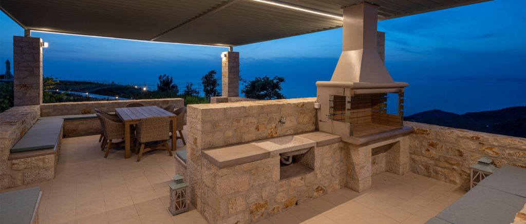 Our open space barbeque installation, near the two large sitting areas, is a great place to spend time with family and friends, preparing a savory feast while enjoying the fragrant gardens and the overall beautiful scenery. A chef on demand will cook for you inspiring, scrumptious dishes based on your favorite flavors. Enjoy your idyllic holidays in Alessia Villa, relishing a delectable gastronomic experience, beholding the views across the Ionian sea.